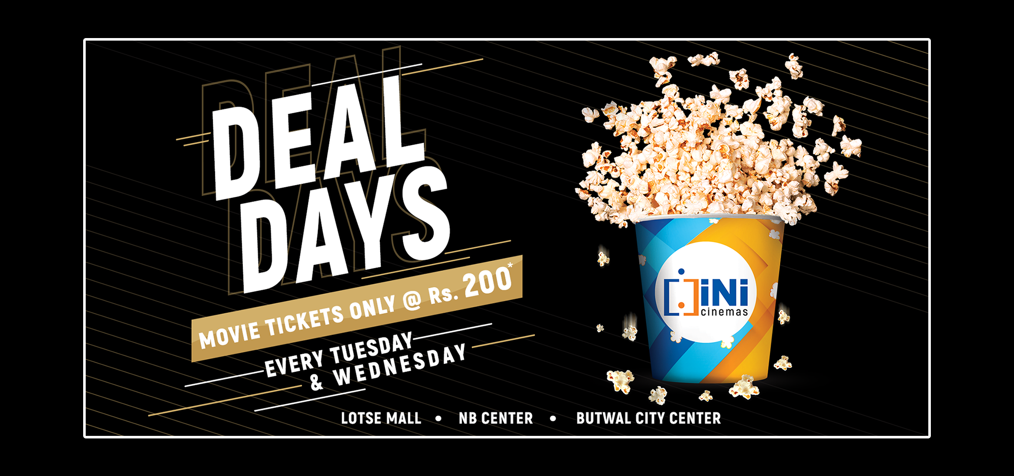 Enjoy movies at only Rs. 200/-* every Tuesday & Wednesday at iNi Cinemas - Lotse, iNi Cinemas - NB Center & iNi Cinemas - Butwal City Center.